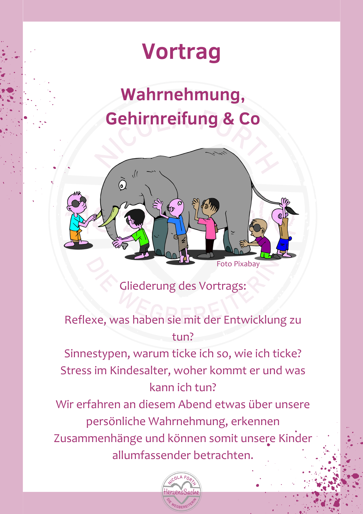All diese Fragen werden dir während des Vortrages beantwortet. Du lernst unterschiedliche Wahrnehmungssysteme und - Typen kennen. Ebenso wirst du vieles über die Entwicklung des Gehirns erfahren und was die frühkindlichen Reflexe mit all dem zu tun haben. Solltest du oder deine Institution Interesse an einem Vortrag haben, melde dich bei mir.
