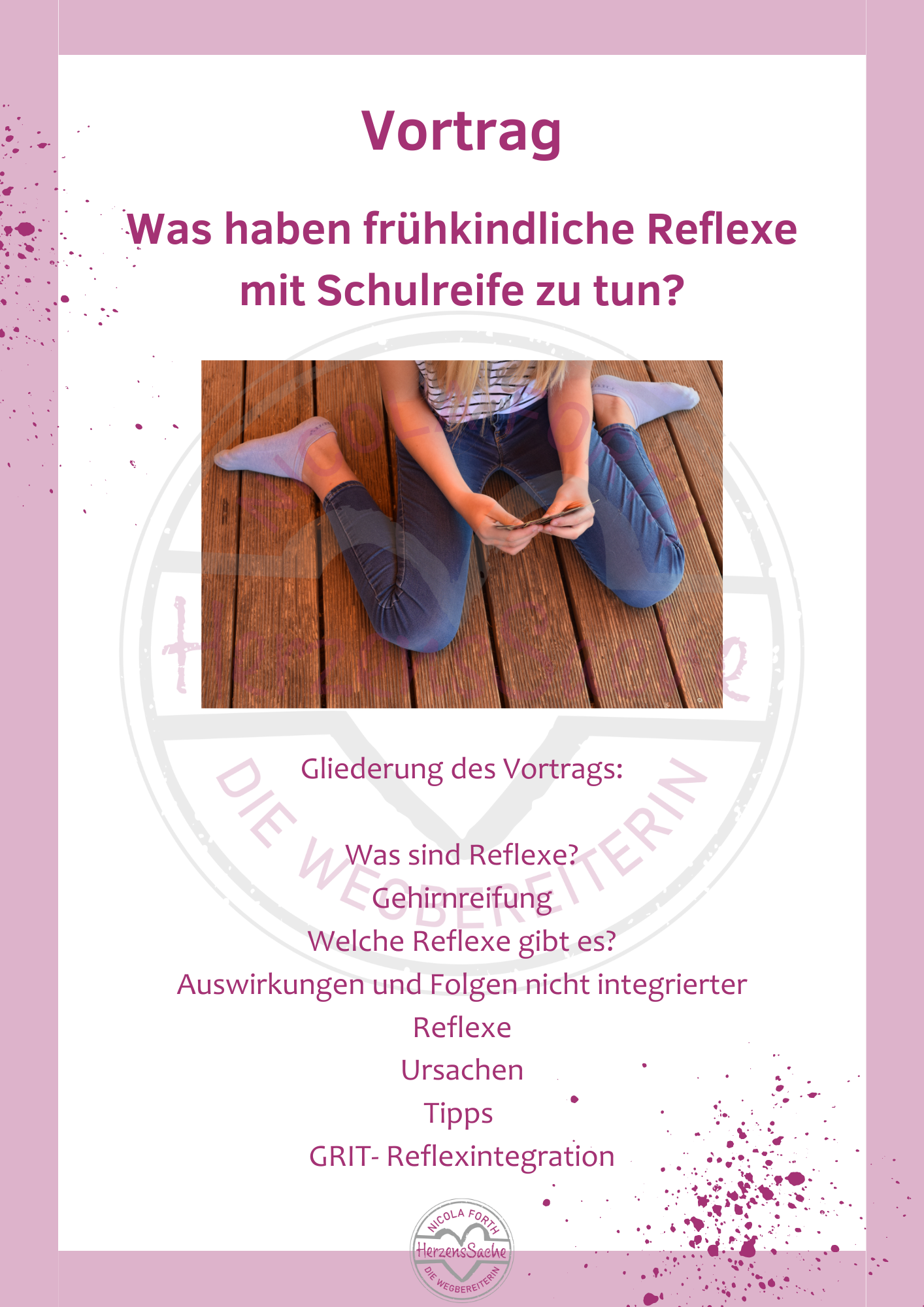 Frühkindliche Reflexe/ Urreflexe in Verbindung mit der Schulreife ist ein wichtiges Thema. Mein Ziel ist es, durch einen Vortrag dich sowie andere interessierte Menschen darüber zu informieren, welche Reflexe es gibt und für welche Auffälligkeiten sie verantwortlich sein können. Ich werde mit dir über die Möglichkeit des GRIT – Ganzheitlichem – Reflex - Integrationstraining sprechen, welches eine Möglichkeit bzw. Lösung sein kann, dem Ganzen entgegenzuwirken und die Reflexe nachträglich zu integrieren.